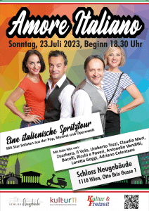 Kommen Sie mit uns auf eine Reise durch die abwechslungsreiche Musikwelt in das wunderbare Bella Italia! Erleben Sie mitreißende, temperamentvolle Bühnenpower. EMOTION PUR! Mit bekannten Hits verwandeln AMORE ITALIANO jeden Abend in eine Welt aus Sonne, Strand und Meer. Die vier Topinterpreten der Pop, Musical und Opernwelt lassen dabei keine Wünsche offen und gestalten mit Professionalität und Humor einen Abend der Sonderklasse. Freuen Sie sich molto auf: Kirlianit Cortez, Merle Saskia, Anna Fay und Domenico Limardo! Zuccero, Il Volo, Umberto Tozzi, Claudia Mori, Bocelli, Ricci e Poveri, Antonello Venditi, Loretta Goggi, Adriano Celentano stehen auf der Liste dieser vier Ausnahmekünstler.